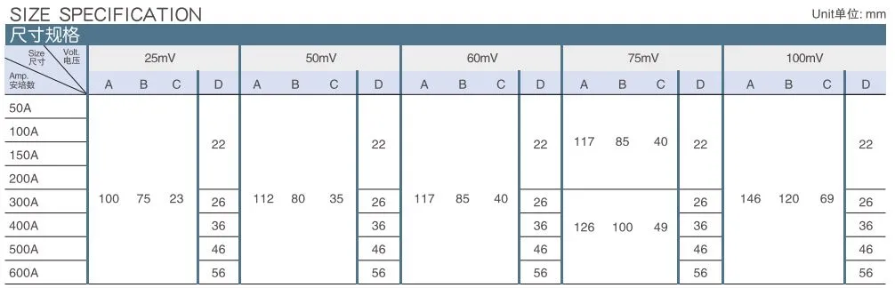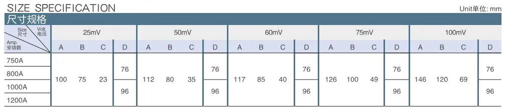 1. Rated voltage drop range: 1A-50A 10mV~800mV;51A-2500A 10mV~300mV; 2501-12000A 10mV~100mV