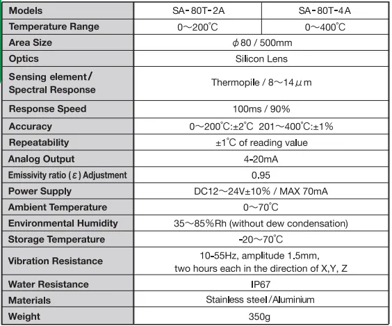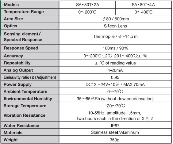 SA-80T-4A : NON-CONTACT THERMOMETER อุปกรณ์วัดอุณหภูมิไม่สัมผัสแบบอินฟราเรด แบบติดตั้งถาวรกับเครื่องจักรมีเกลียวติดตั้ง M18x1.0 สามารถวัดอุณภูมิได้เที่ยงตรง และแม่นยํากว่าแบบพกพา ให้สัญญาณเอาท์พุทเป็นสัญญาณอะนาลอก 4-20mA เพื่อความสะดวกในการนําไปประมวลผลหรือใช้งาน โดยสามารถนําไปต่อร่วมกับเครื่องแสดงผลหรือเครื่องควบคุมภายนอกได้