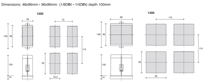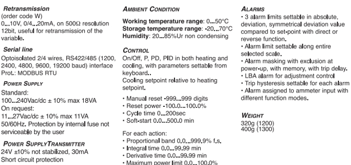 1200-Series เป็น Controller ขนาด 48x96 mm. และ 1300-Series เป็น Controller ขนาด 96x96 mm. ที่สามารถรับเป็น Universal Input ได้ทั้ง Thermocouple, PT100, NTC/PTC, Linear input สามารถรับ CT เพื่อเช็ค Heater ขาดได้, สามารถเลือก Setpoint, Manual-Automatic mode, reset alarm memory หรือ Hold Function ได้ด้วย Digital Input