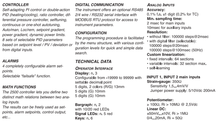 2500-Series เป็น Controller ขนาด 96 x 96 mm. ที่ทำงานด้วยความเร็วสูง สามารถสั่งงานได้ในเวลา 2 mSec. สามารถรับ Input ได้ ทั้ง Thermocouple, PT100, Stain gauge, Potentiometer และ Linear Signal Output แบบ Analog Output, Relay Output