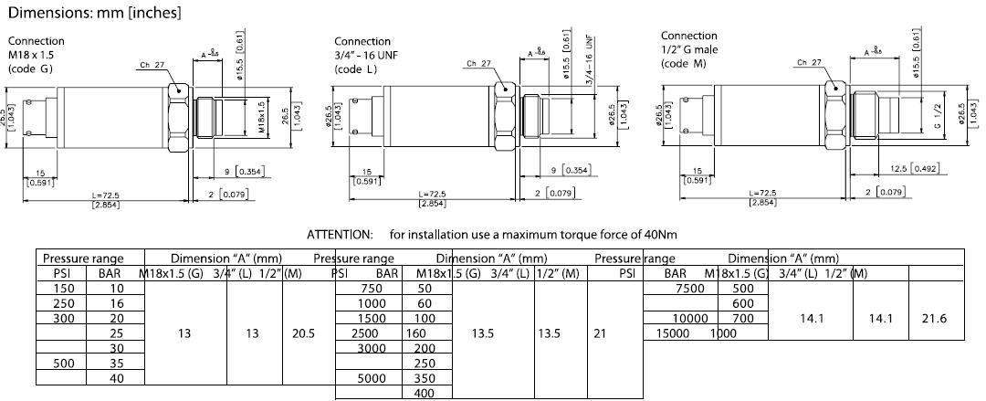 • ย่านการวัด : 0-10 ถึง 0-1000 bar / 0-150 ถึง 0-15000 psi