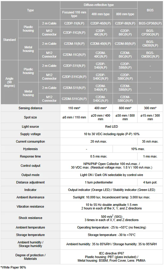 • ระยะการตรวจจับได้ไกลถึง 20m. (thru-Beam), 4m. (retro reflective), 80cm. (diffuse reflective)