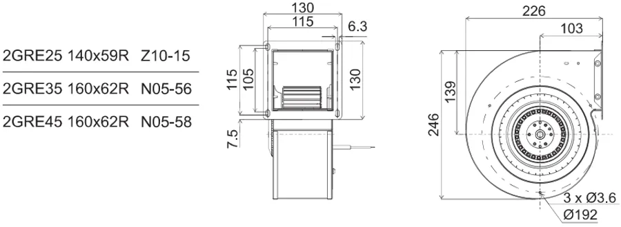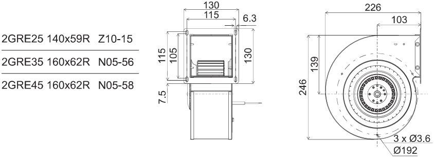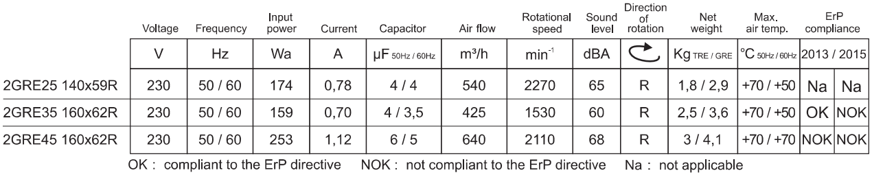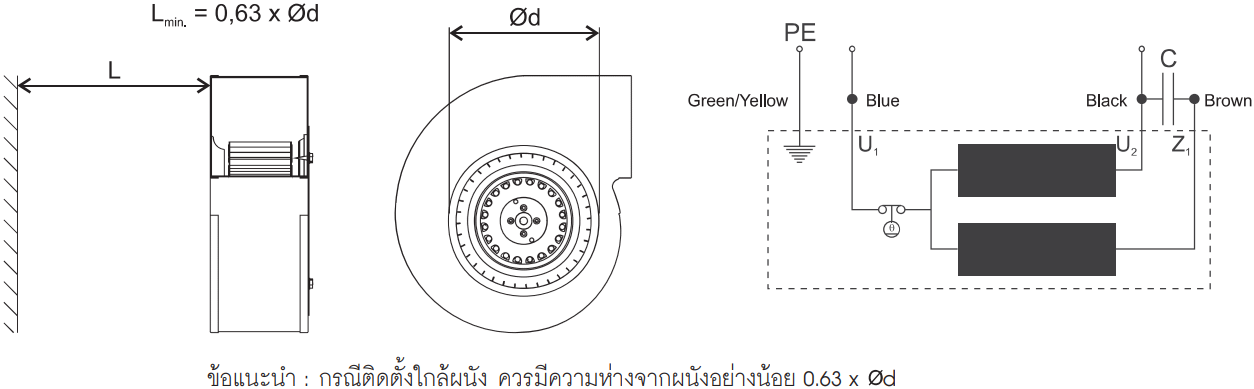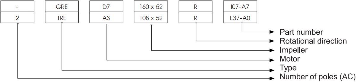 GRE Series Centifugal Single Inlet Fans พัดลมแบบหอยโข่ง พัดลมแบบนี้ (TRE) จะประกอบเป็นพัดลมแบบหอยโข่งได้ 2 ประเภทคือ แบบโครงนอกเป็นเหล็ก (GRE), และแบบ โครงนอกเป็นอะลูมิเนียม (GRK),พัดลมรุ่นนี้ต่างจาก GRT-DTR คือ ใช้งานที่อุณหภูมิ -20 ํC กับ +50 ํC,Design Code Rotational Direction Impeller Lamination Stack Length Type Numbeeer of Poles 2 TRE 15 120x42 R N05-06 อายุการใช้งานเฉลี่ย 50,000 ชั่วโมง, ระบบรองรับการหมุนเป็นแบบ Ball bearing, Protection IP44, G2.5